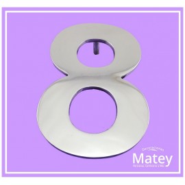 NUMERO OCHO DE 20 CM CON PERNOS PARA SUJETAR SOBRE LA PARED, HECHO EN ALUMINIO PULIDO, CON MEDIDA DE ALTO 200 MM, ESPESOR 6 MM Y ANCHO 127 MM.